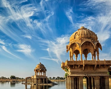 Experience the tranquility of Gadisar Lake, a man-made reservoir in the heart of Jaisalmer. The lake is surrounded by ornate temples, ghats, and a grand entrance arch, creating a picturesque setting.