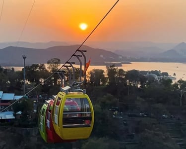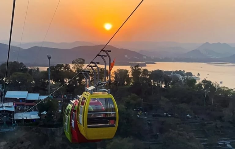 Karni Mata Ropeway takes visitors from Dudh Talai to Karni Mata Temple hilltop. The ropeway ride provides aerial views of Udaipur city, lakes, and sunset landscapes, making it one of the most exciting experiences in the city.