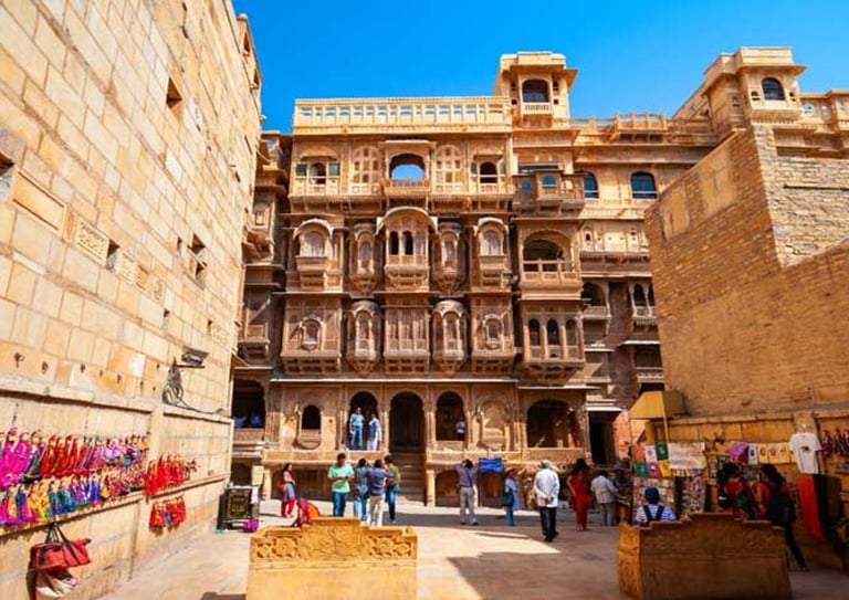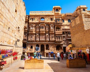 Patwon Ki Haveli is a group of grand mansions famous for detailed jharokhas, carvings, and royal interiors. It reflects the rich merchant history of Jaisalmer and is a must-visit stop arranged by Nakoda Tours And Travels Agency.