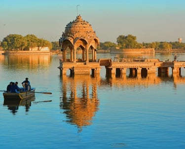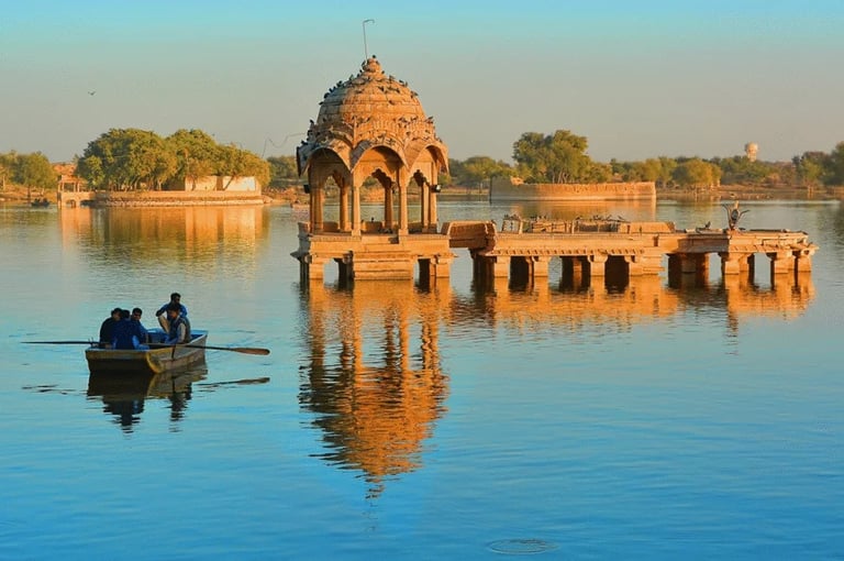 Gadisar Lake is a peaceful artificial lake surrounded by temples and ghats. Visitors enjoy boating and scenic views, making it a relaxing stop during your journey with Nakoda Tours And Travels Agency.